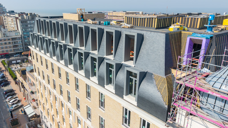 Het dak van The Grand is opgebouwd uit een verfijnde combinatie van zinken dakkapellen en natuurleien. Er werd bewust gekozen voor duurzame en esthetisch hoogwaardige materialen, zonder enige toegeving.