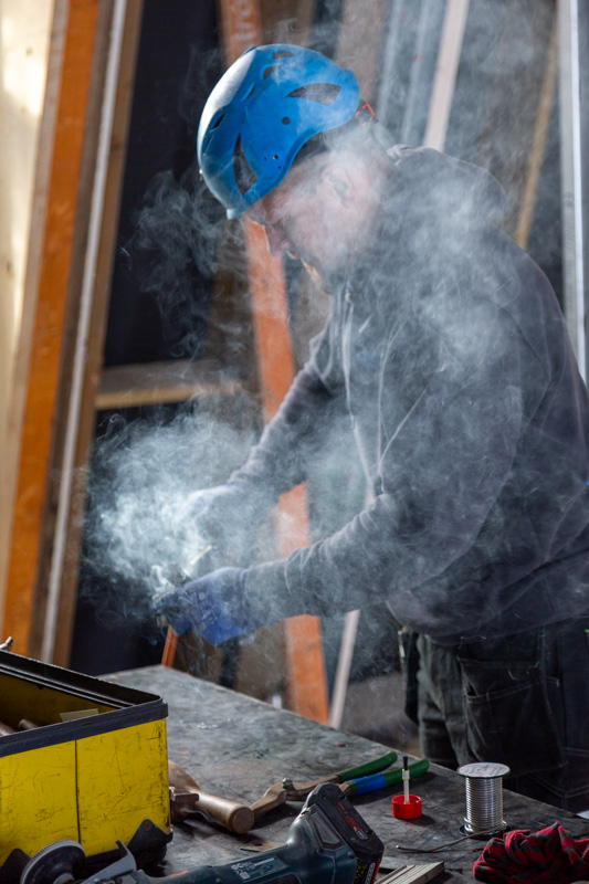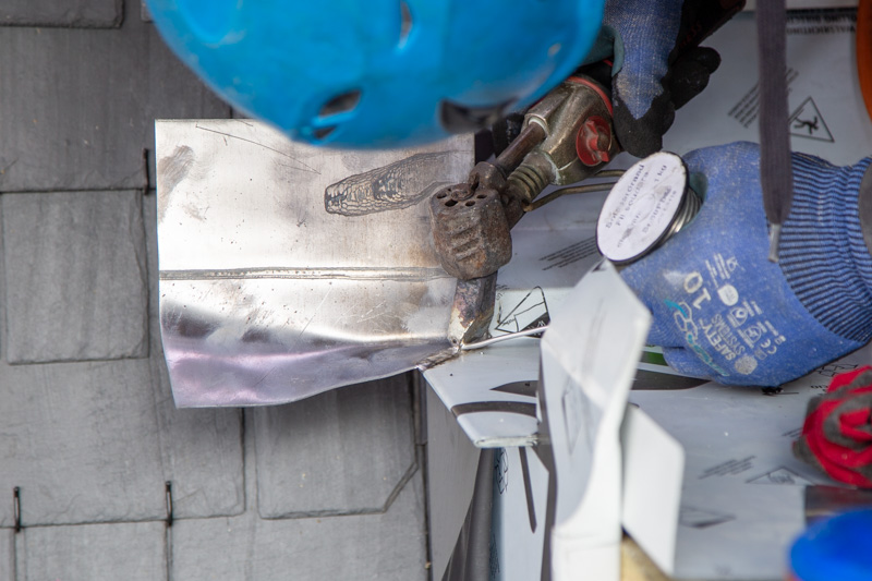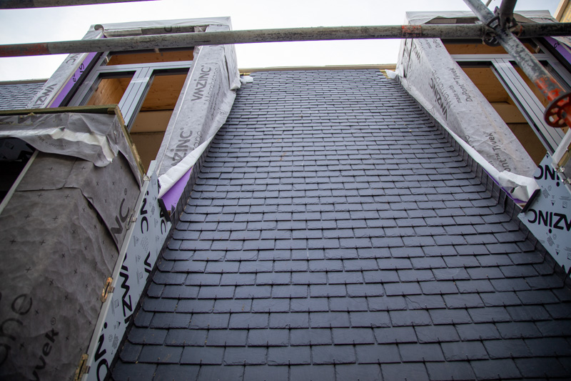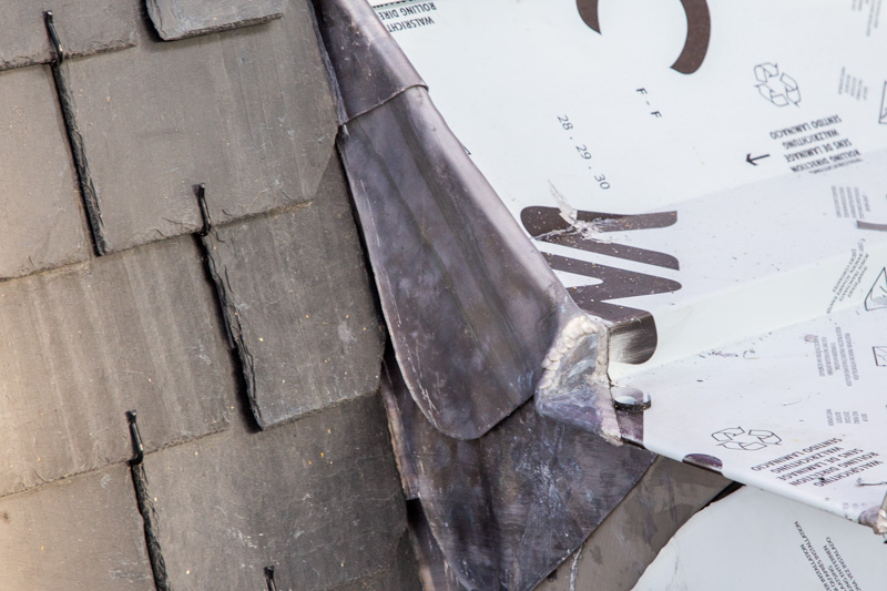 Als sluitstuk wordt de hoektoren afgewerkt met een combinatie van natuurleien en een zinken ornament, dat op de grond wordt opgebouwd en vervolgens in één beweging op zijn plaats wordt gehesen.