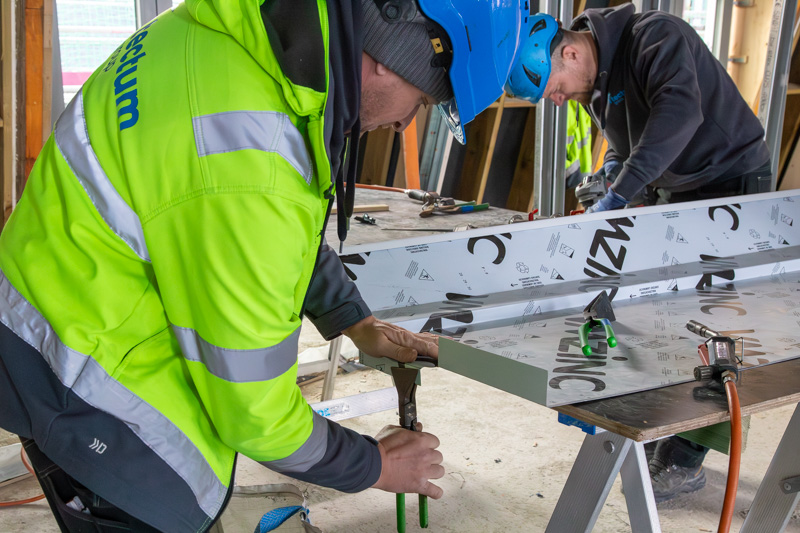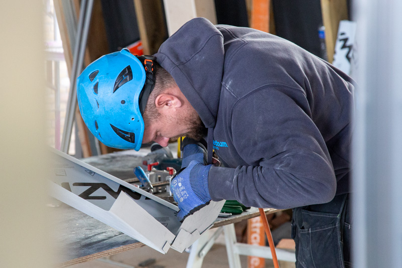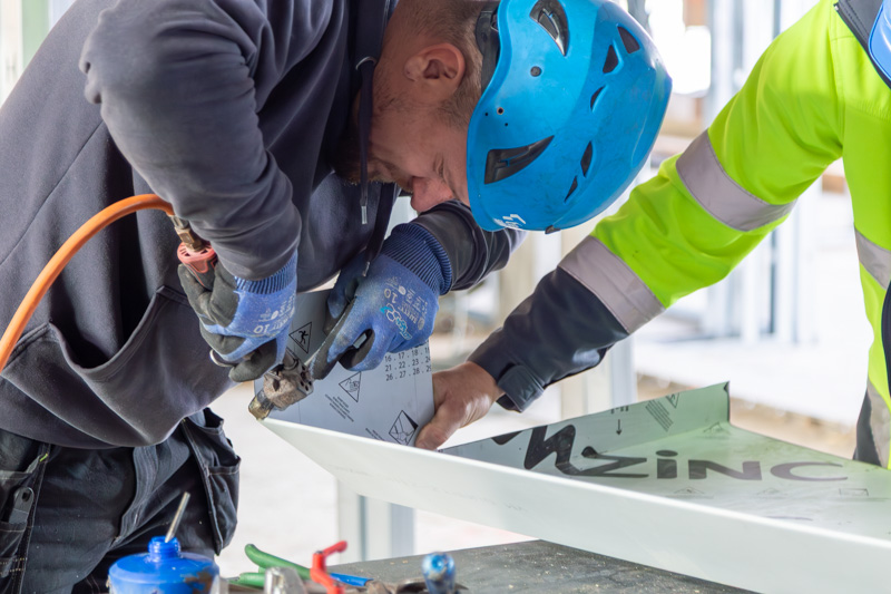 Voor de zinkwerken wordt maximaal ingezet op precisie en efficiëntie. Afhankelijk van de complexiteit worden de zinkpanelen ofwel ter plaatse gevormd, ofwel volledig voorbereid in het zinkatelier. Vooral bij de meer complexe en gebogen vormen gebeurt de productie in het atelier, waar elk element tot in detail wordt uitgewerkt. Nadien worden deze onderdelen in hun geheel naar de werf gebracht en gemonteerd. Deze werkwijze garandeert niet alleen een hogere afwerkingsgraad, maar zorgt er ook voor dat de plaatsing op de werf vlot en nauwkeurig kan verlopen, zelfs bij de meest uitdagende vormen van het dak.